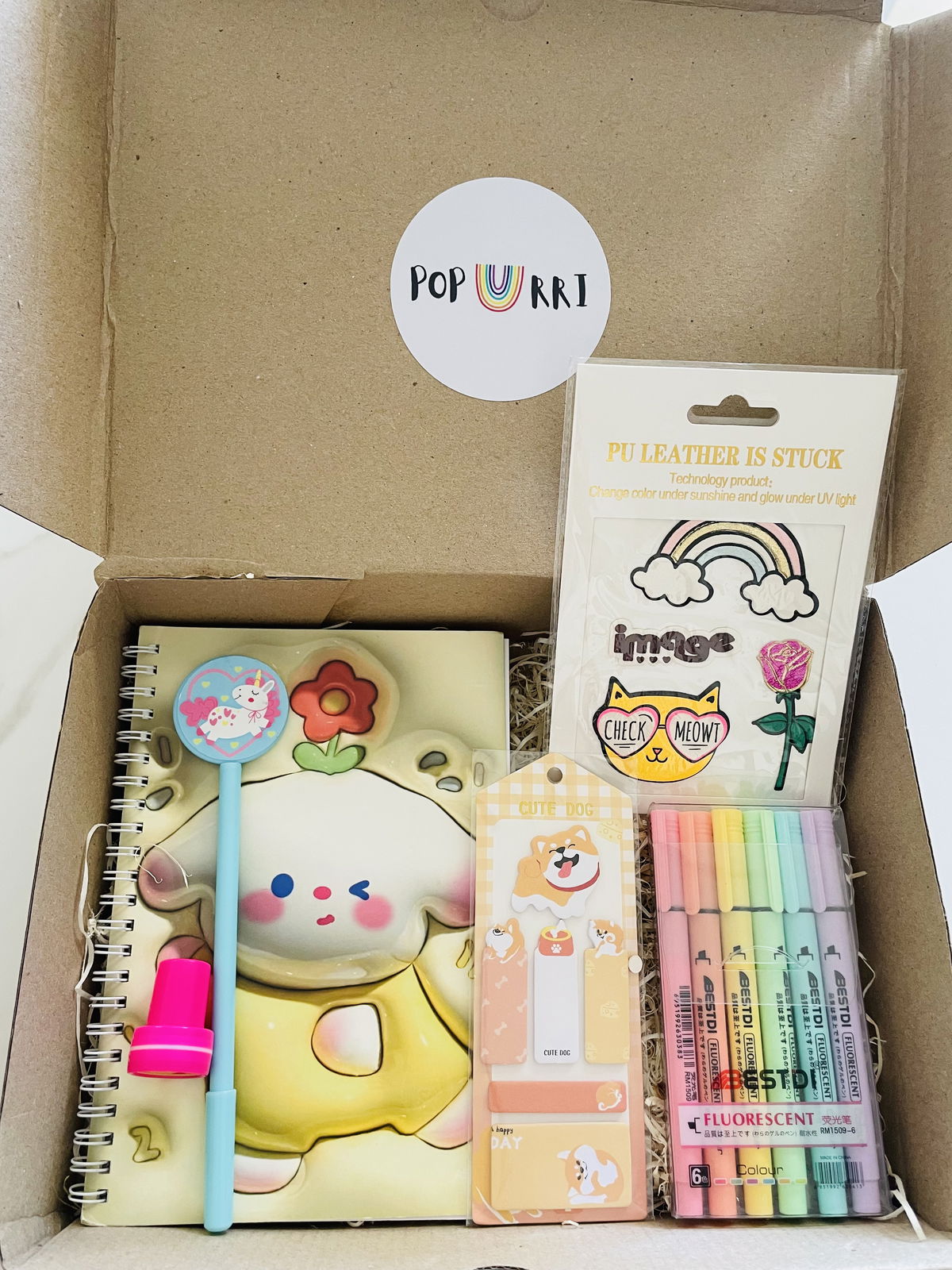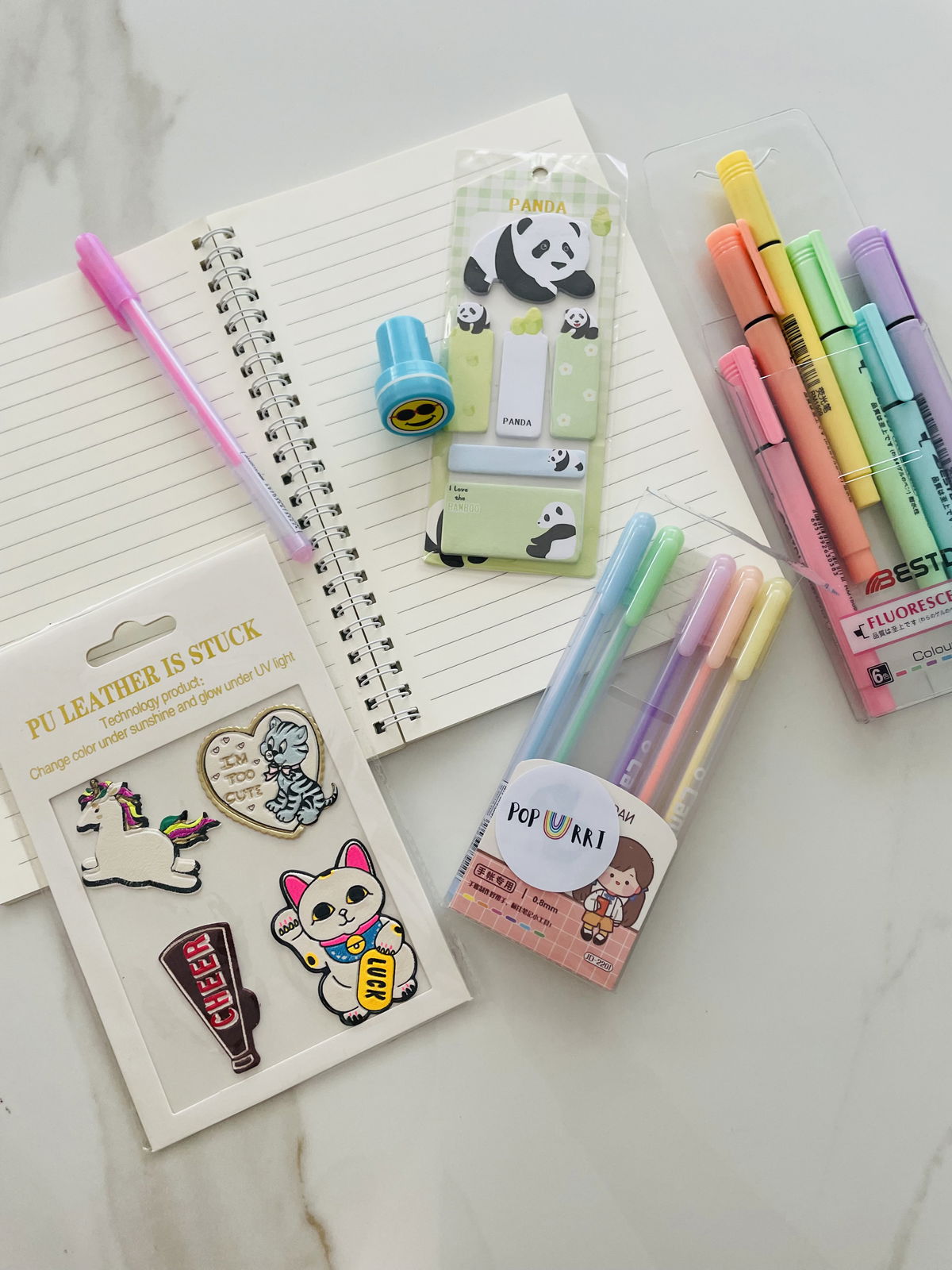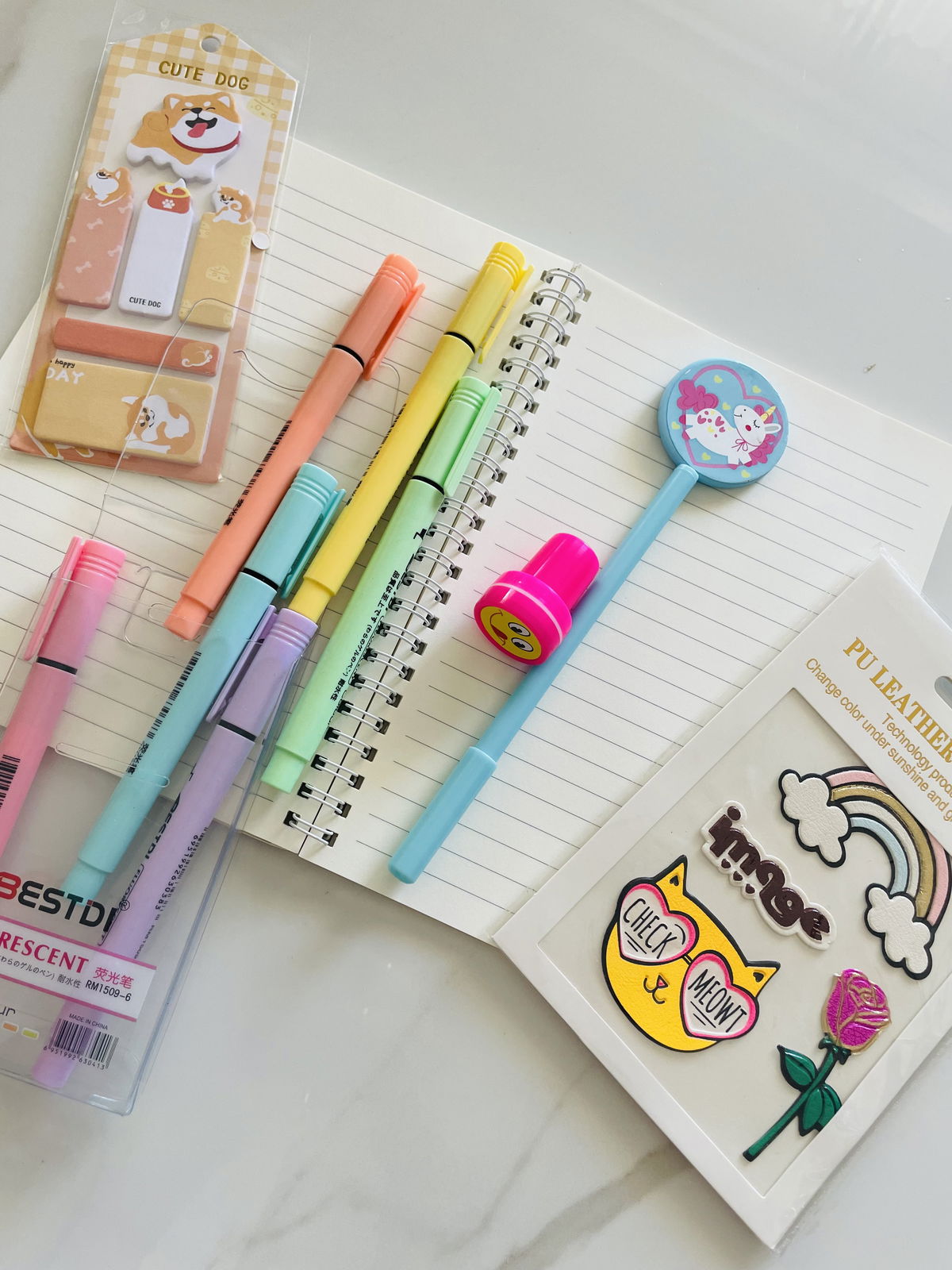 KIT CUTIE CUADERNO + RESALTADORES + BIROMES + SELLITO + STICKYNOTE + PARCHES