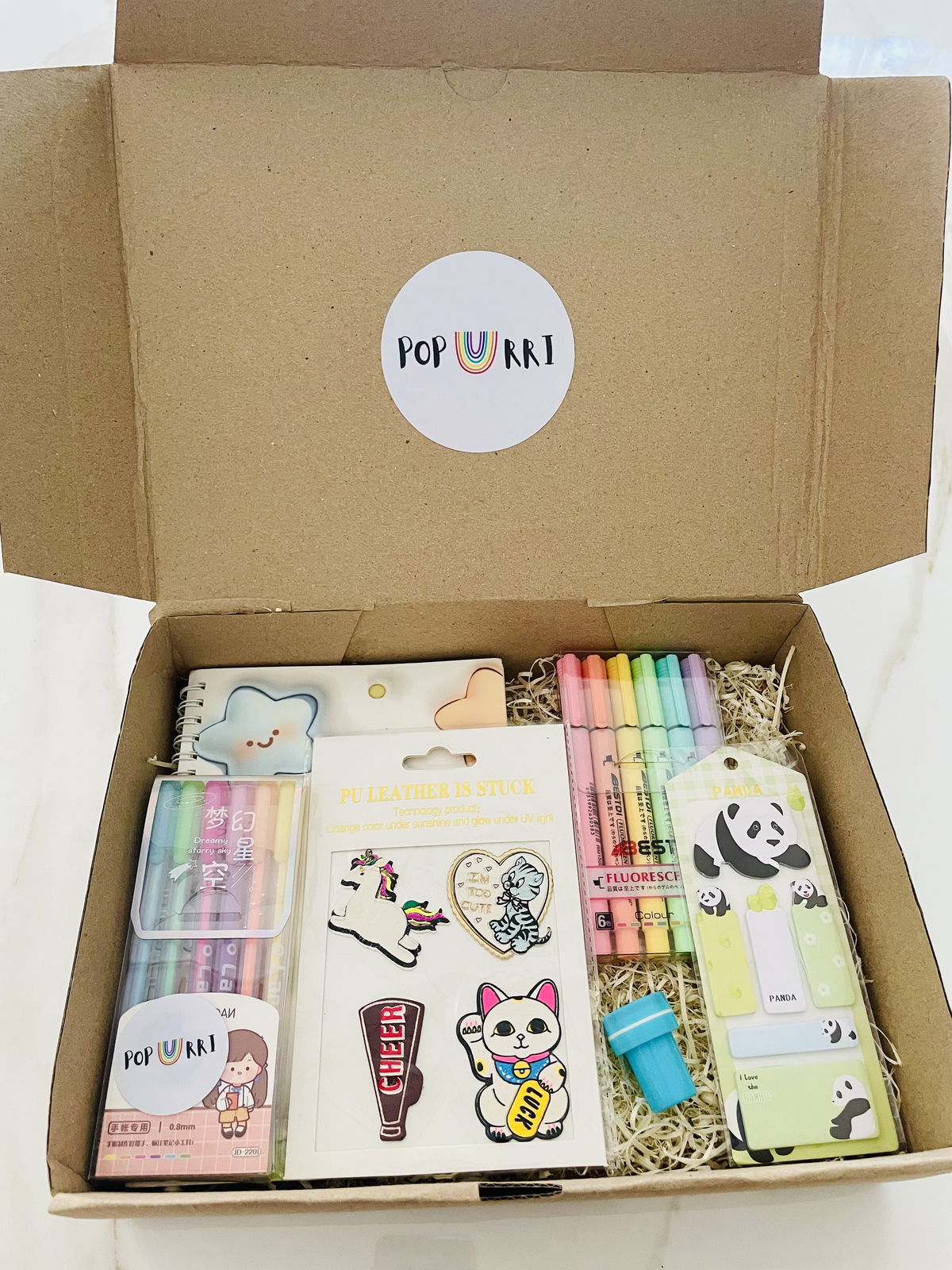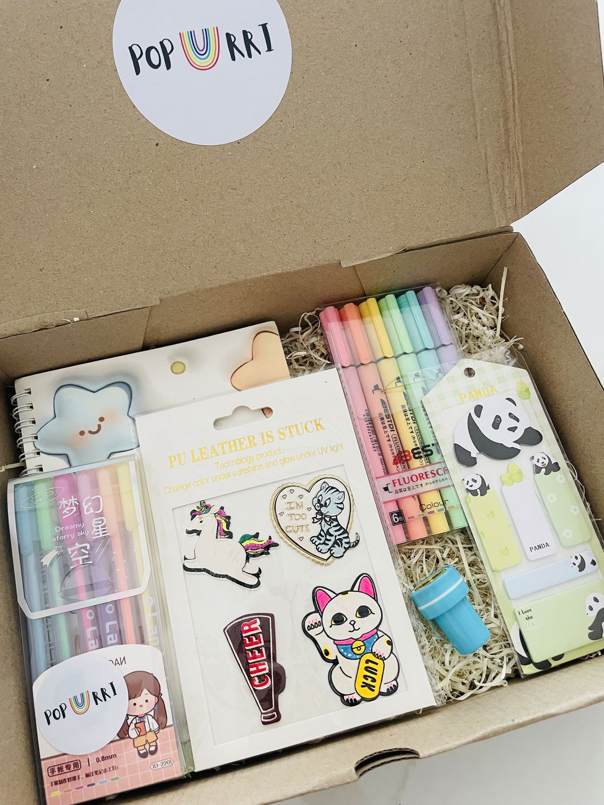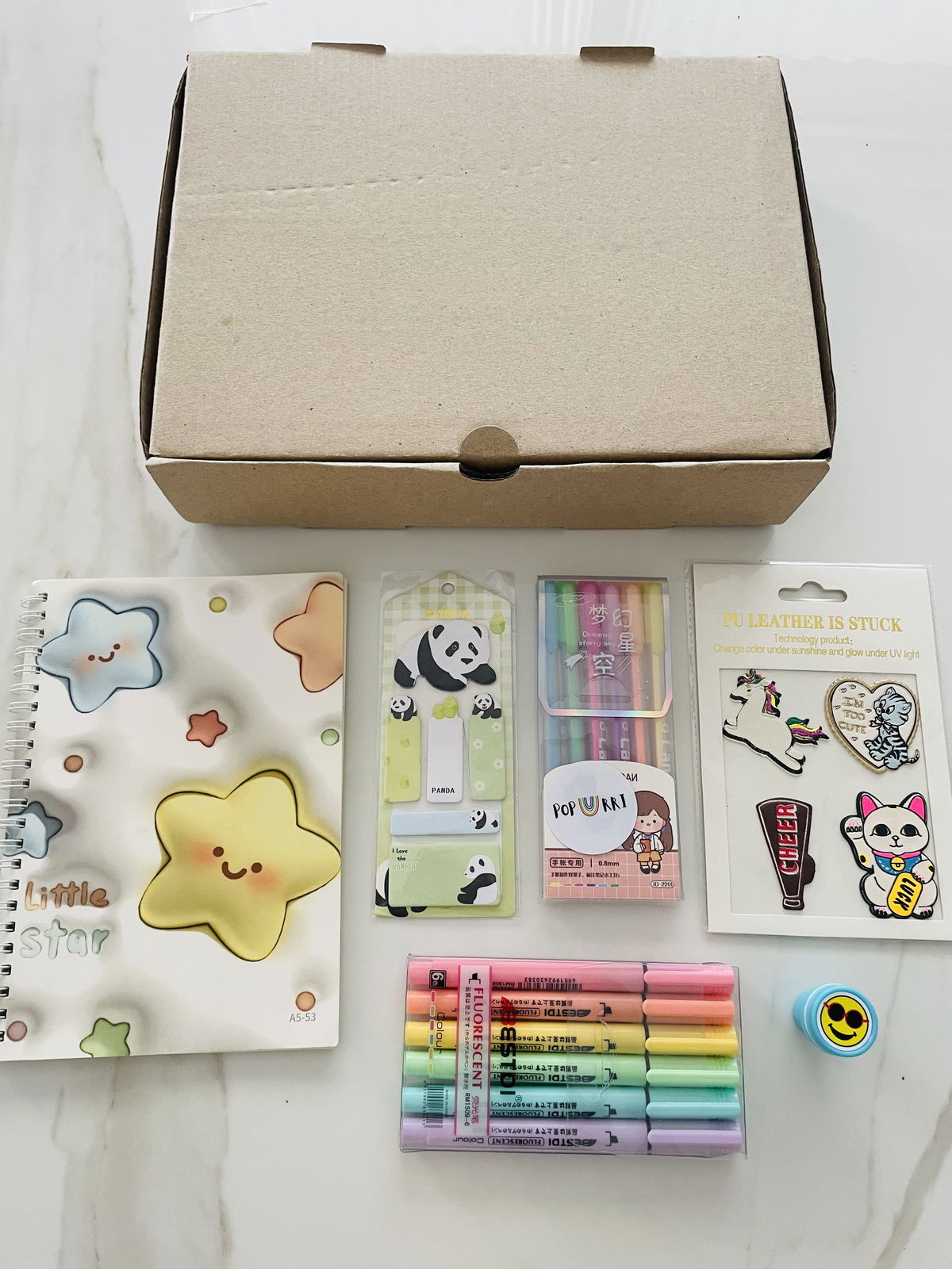 KIT CUTIE CUADERNO + RESALTADORES + BIROMES + SELLITO + STICKYNOTE + PARCHES