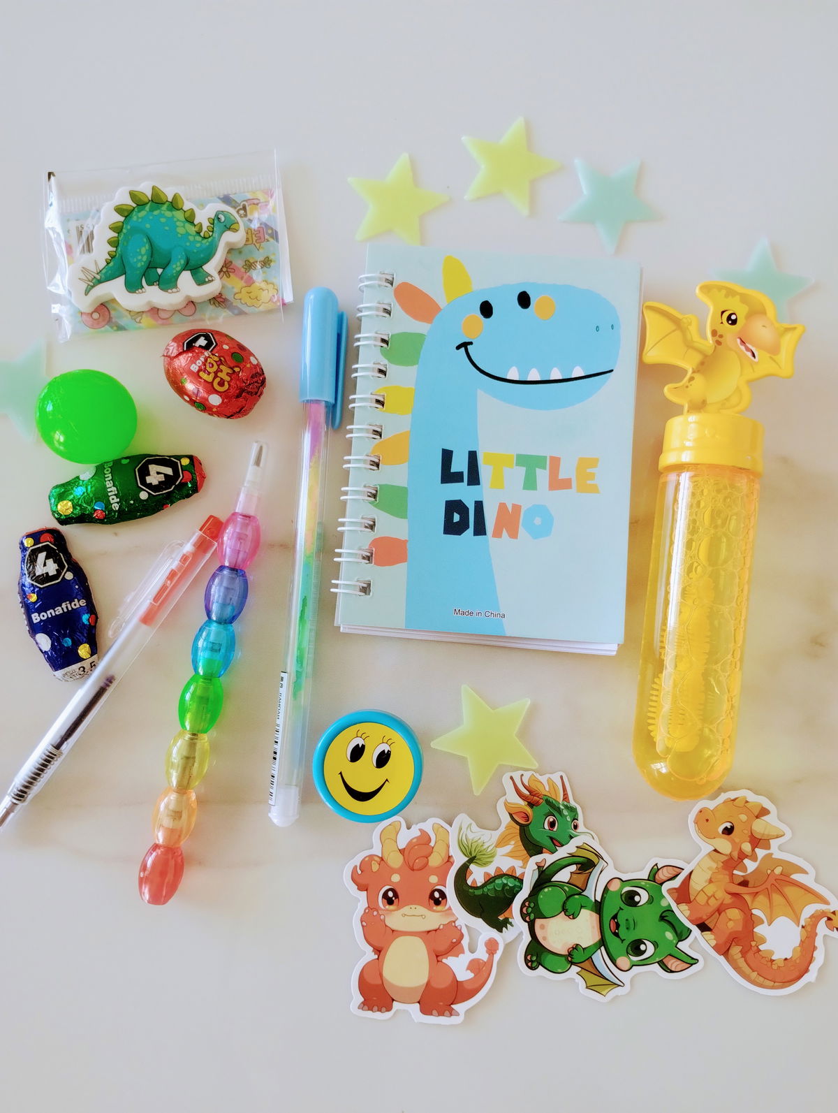 STITCH: Incluye llavero peluche, libretita, gomita de pelo, pulsera, birome, stickers, pins de crocs, diamond art, estrellitas fluorescentes + 3 mini huevitos y dos mini conejitos de chocolate