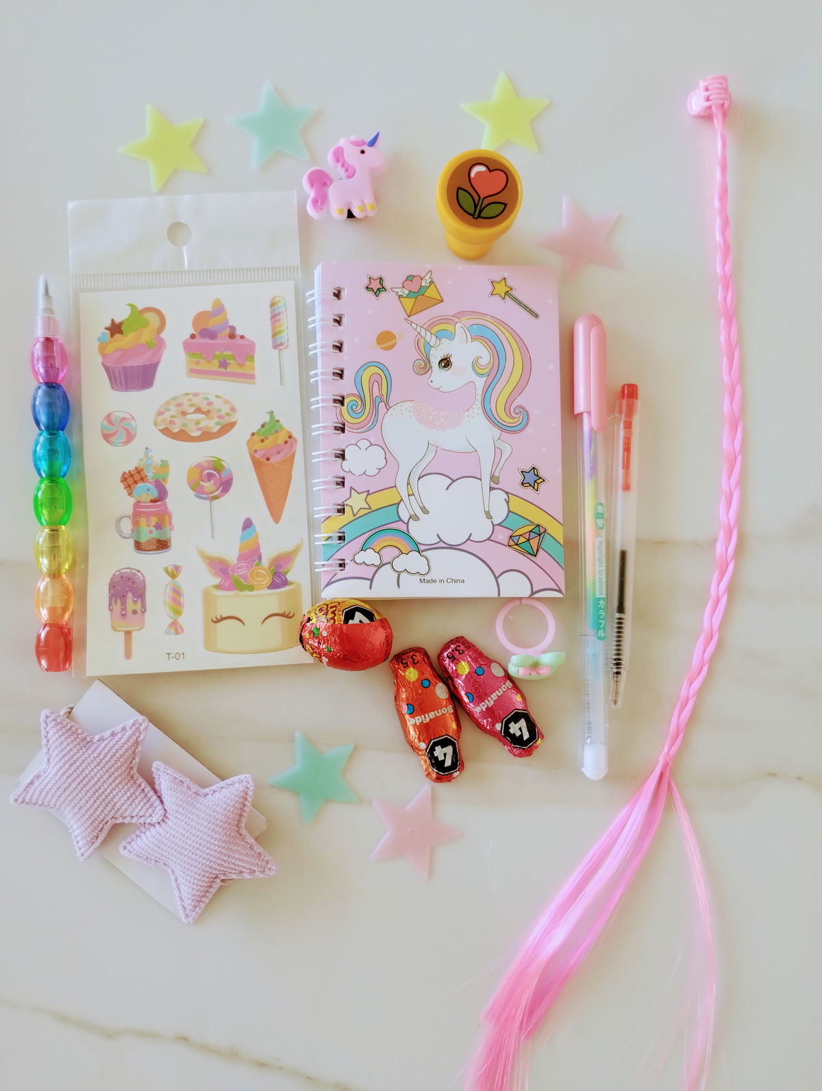 UNICORNIO: Incluye squishy, birome, lápiz, tatoo, stickers, pins de crocs, pulsera, scrunch, pelos de colores, estrellitas fluorescentes + 3 mini huevitos y 2 mini conejitos de chocolate