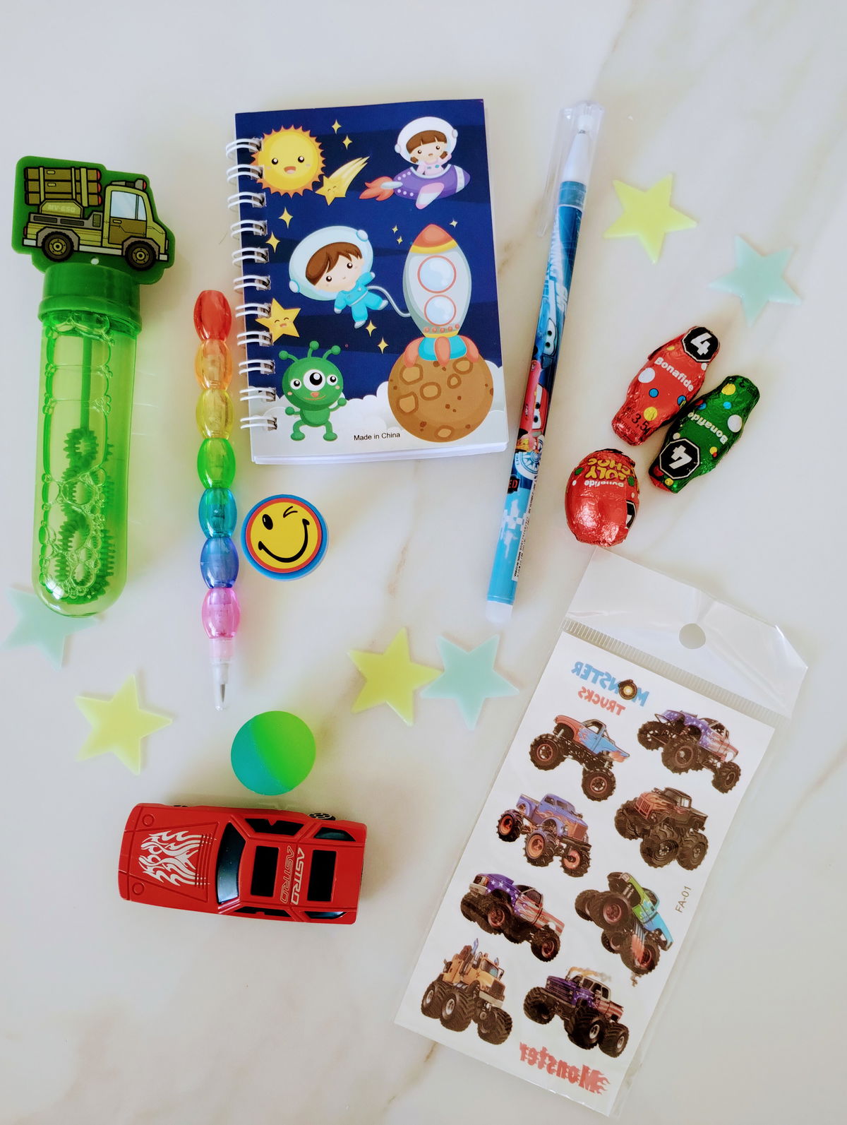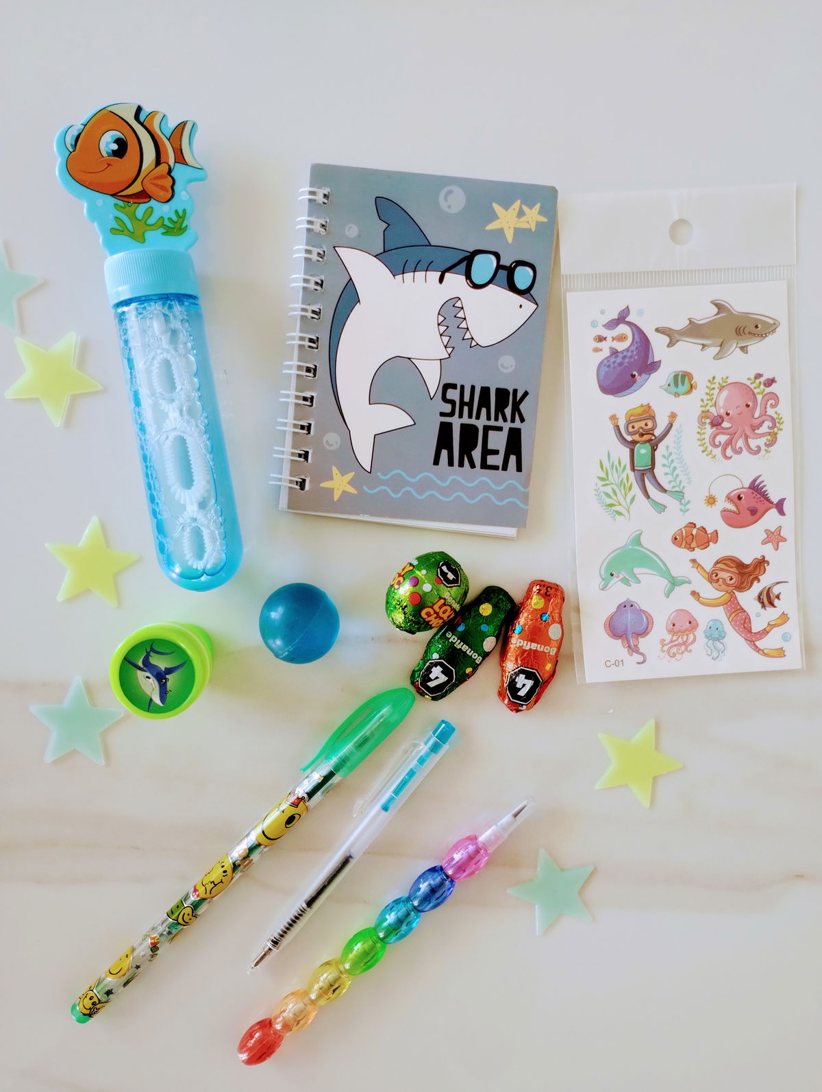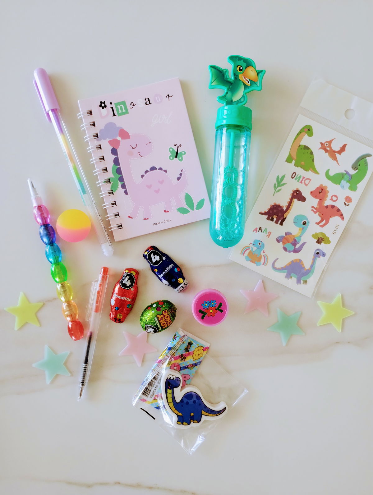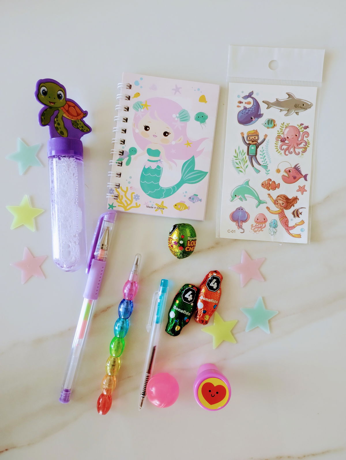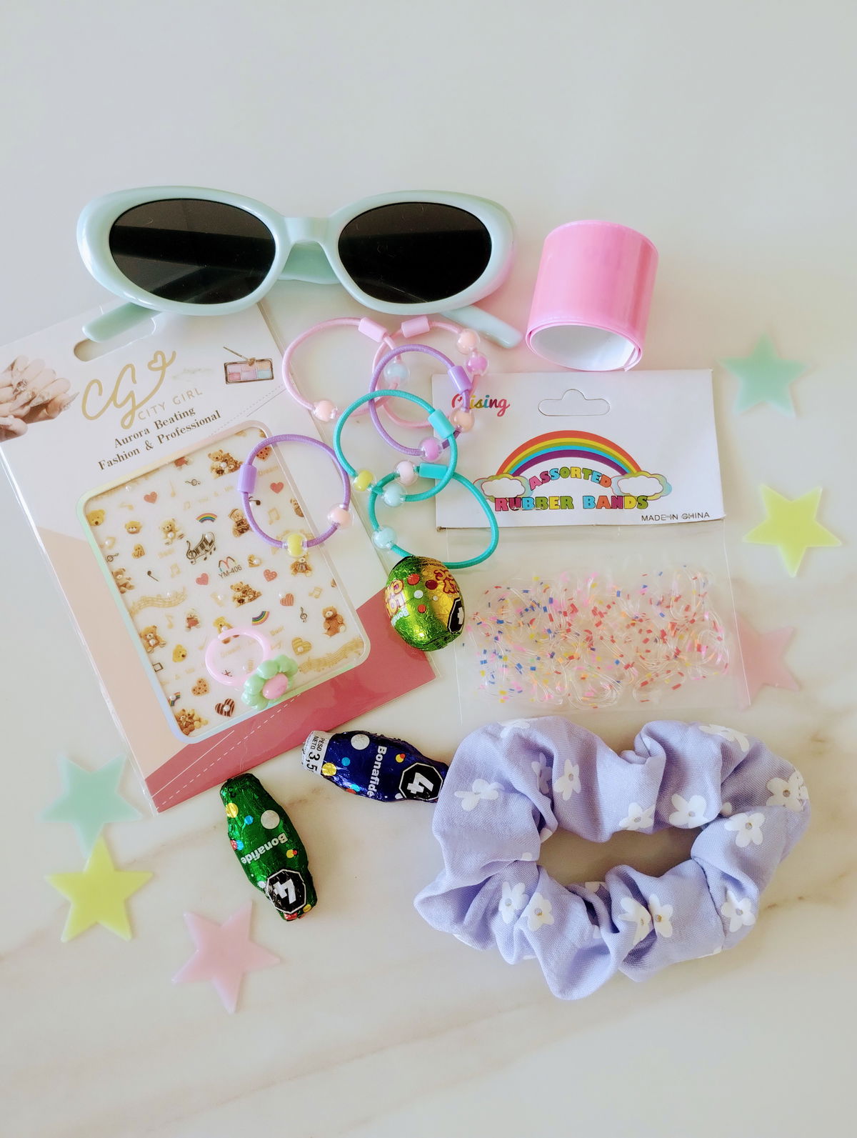MIX CUTE: Incluye Squishy huellita, birome gatitos, libretita, scrunch, resaltadores, birmome arcoíris, sellito, post it, parches de ropa, estrellitas fluorescentes + 3 mini huevitos y 2 conejitos de chocolate
