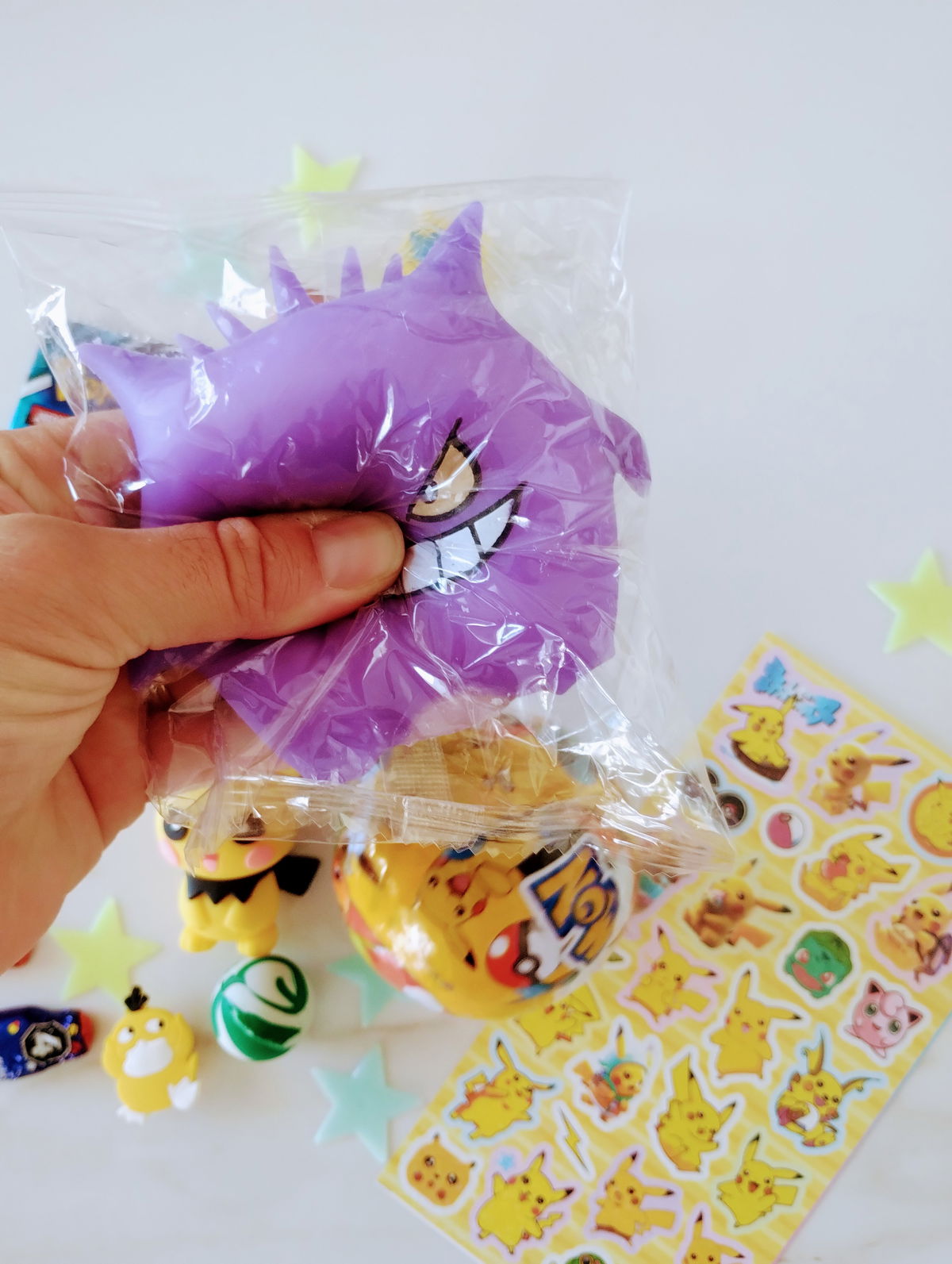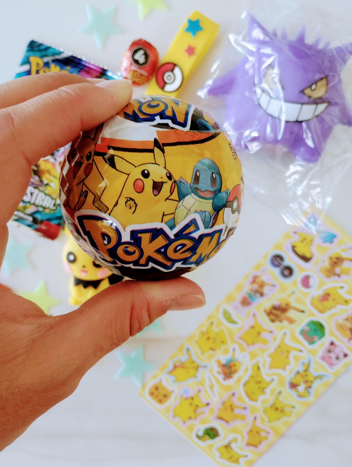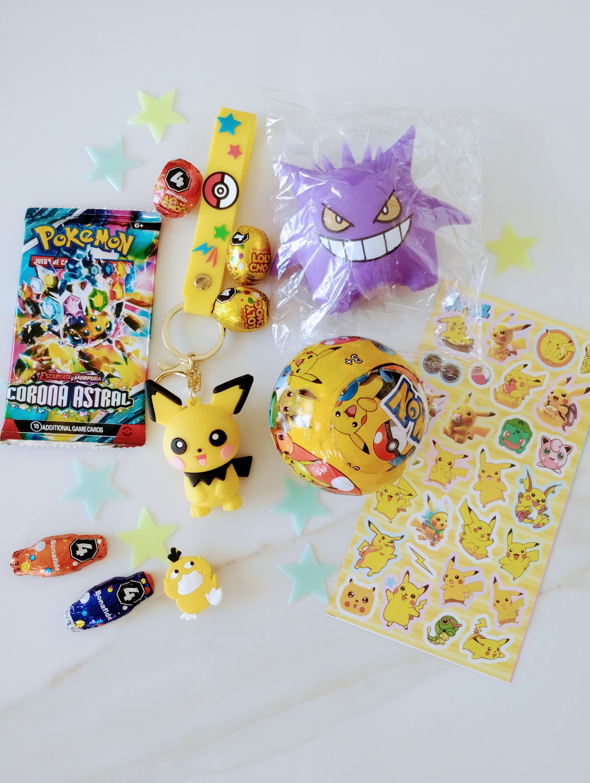 POKEMON: Incluye pokebola, llavero, cartas coleccionables, squishy, pins de crocs, stickers, estrellitas fluorescentes + 3 mini huevitos y 2 mini conejitos de chocolate
