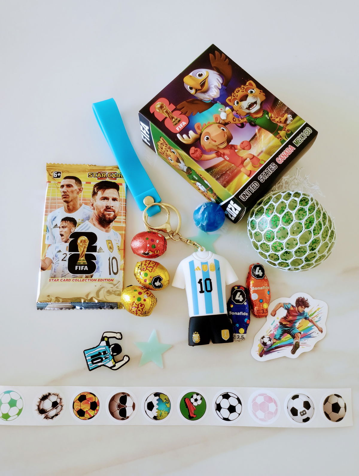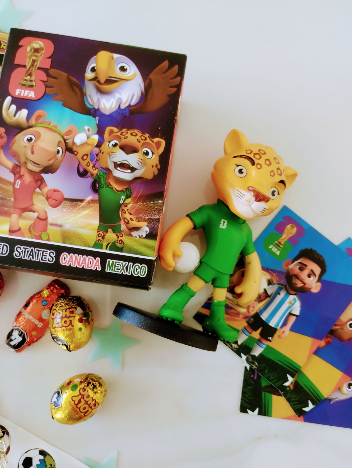 MUNDIAL: Incluye muñequito “animales del mundial”, llavero selección, cartas coleccionables, squishy pelota, pins de crocs, stickers, estrellitas fluorescentes + 3 mini huevitos y dos mini conejitos de chocolate