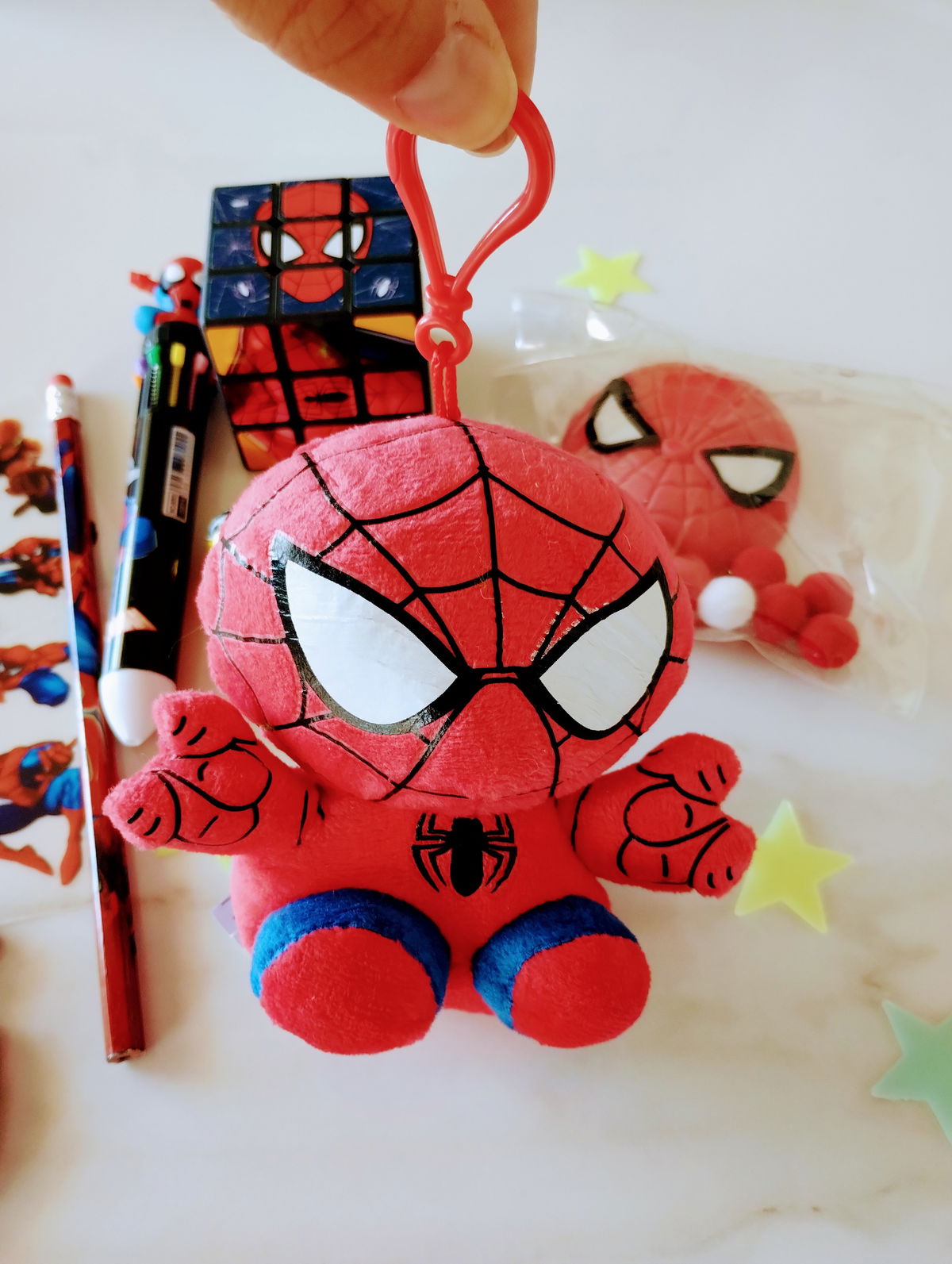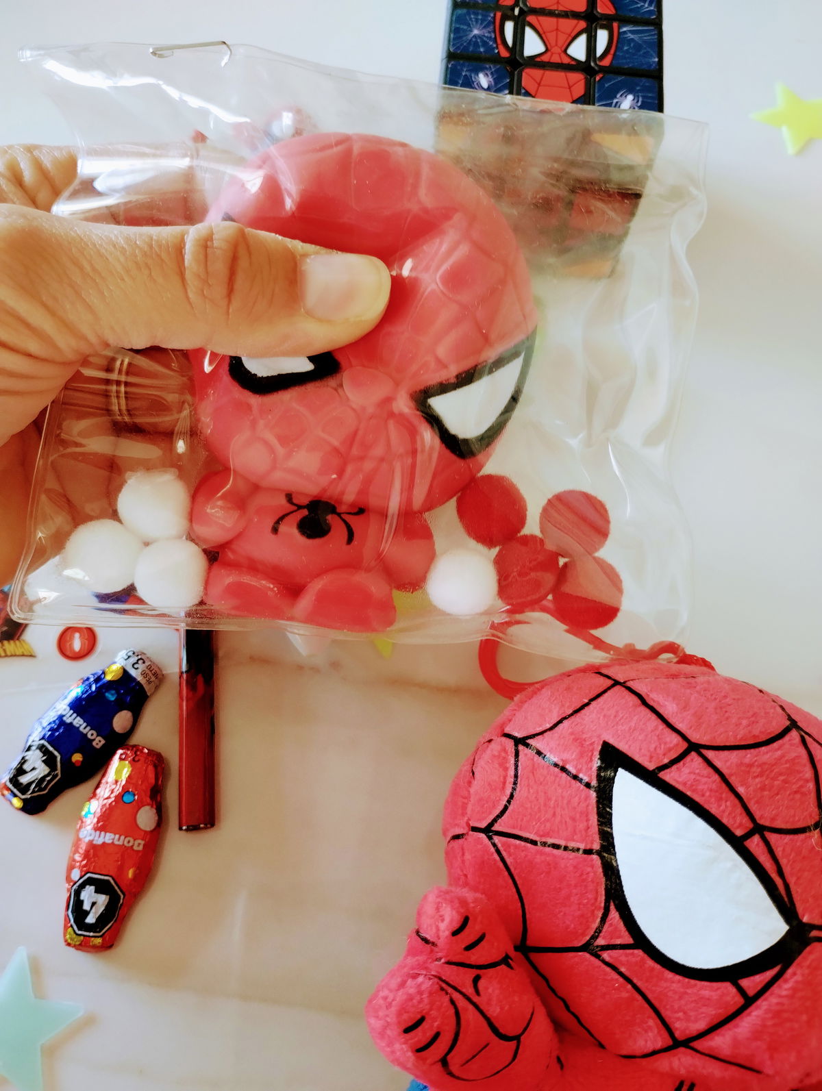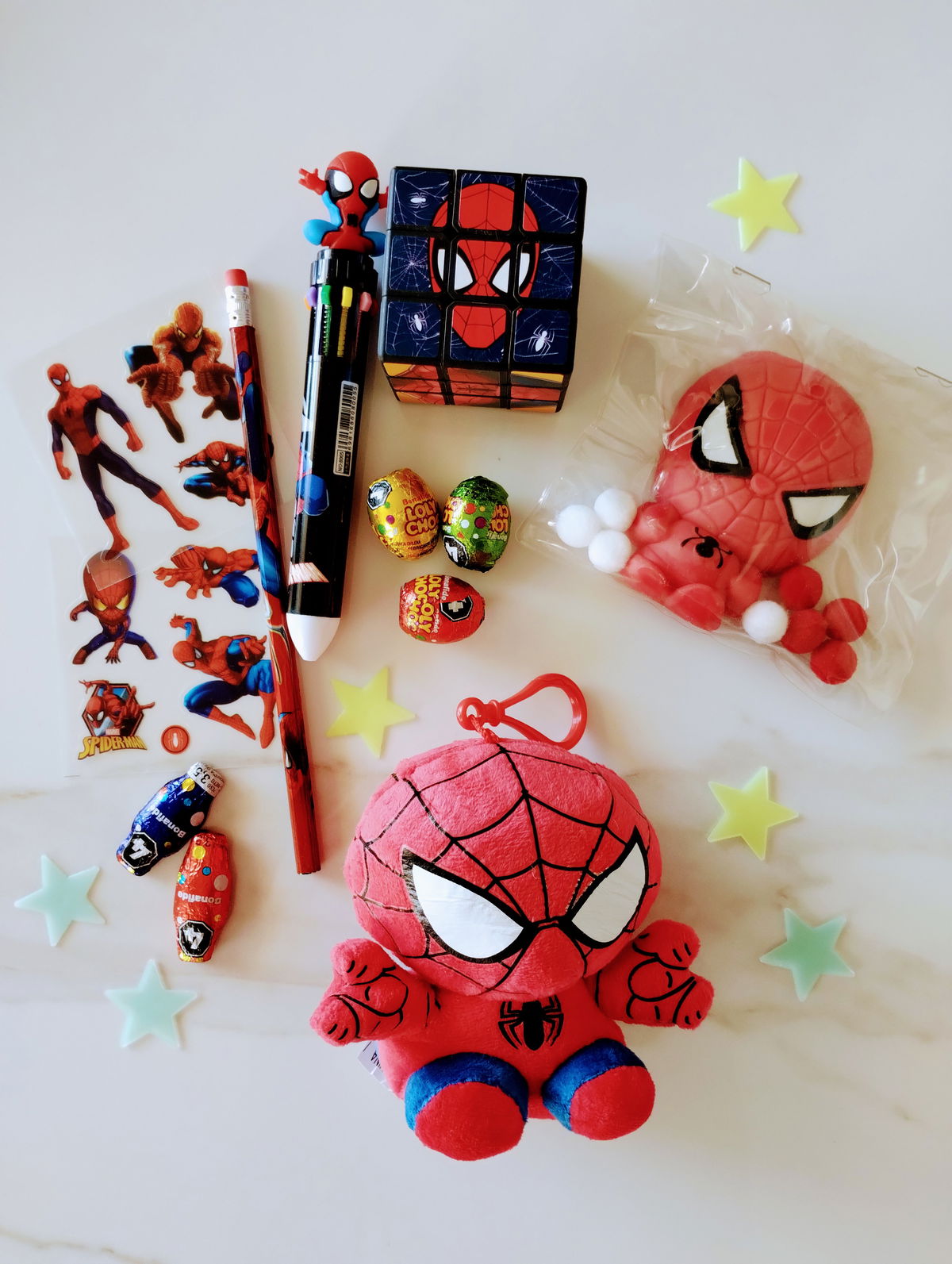 SPIDERMAN: Incluye llavero peluche, birome, lápiz, squishy, stickers, pins de crocs, cubo mágico , estrellitas fluorescentes + 3 mini huevitos y dos mini conejitos de chocolate
