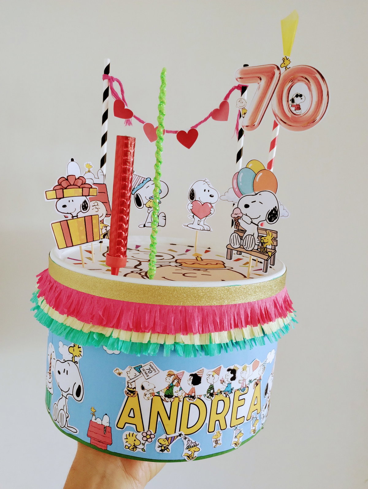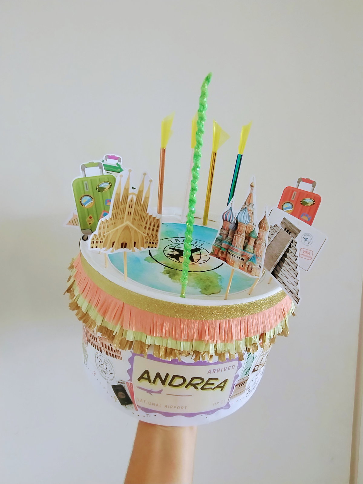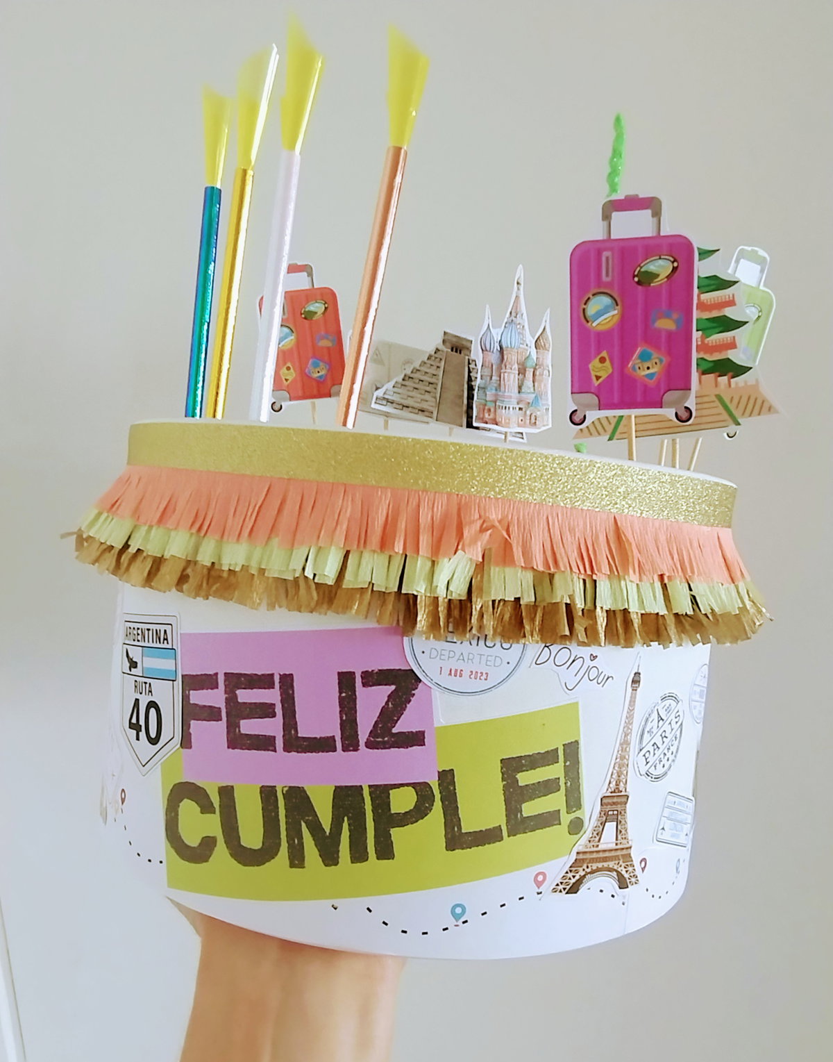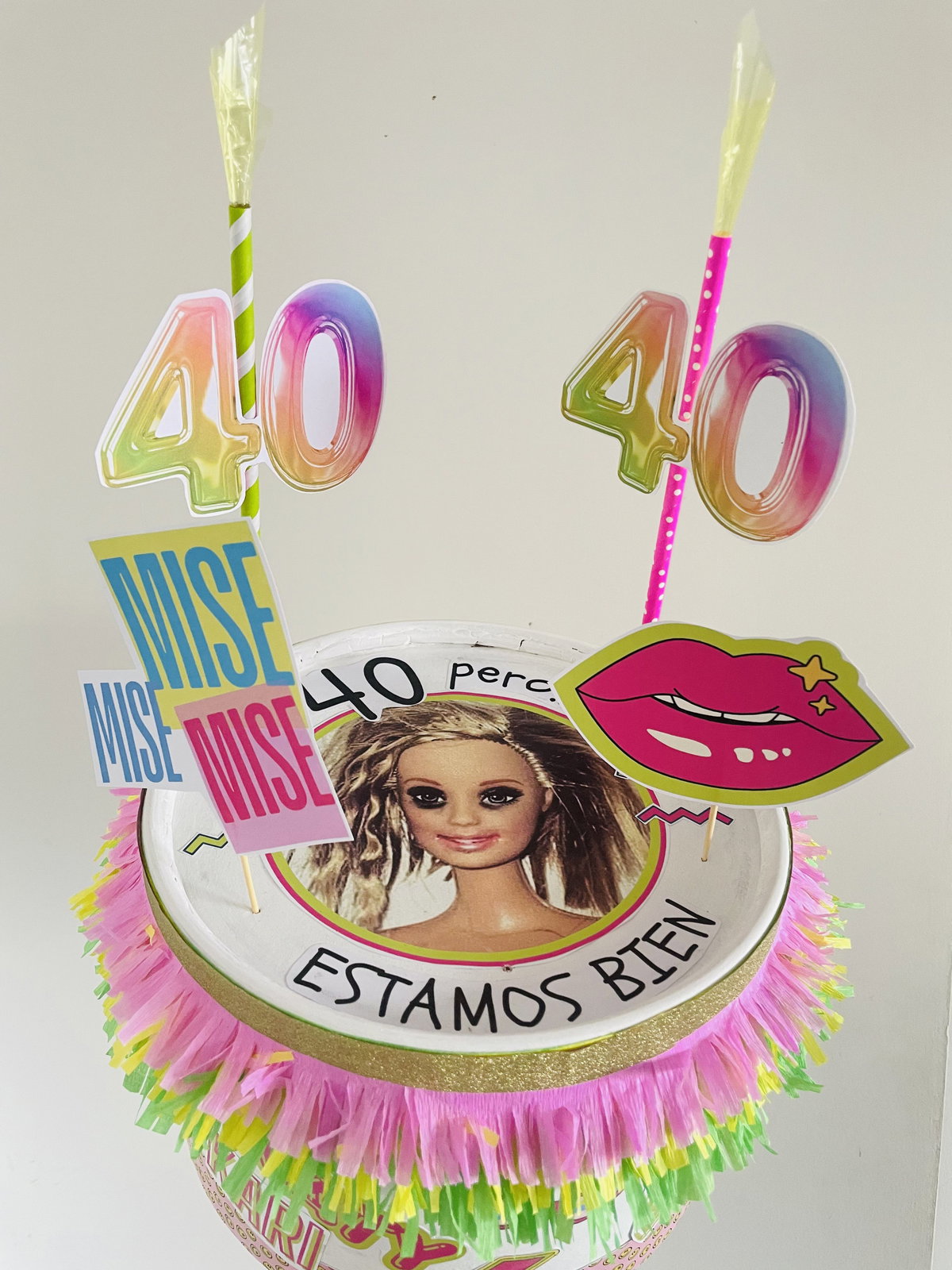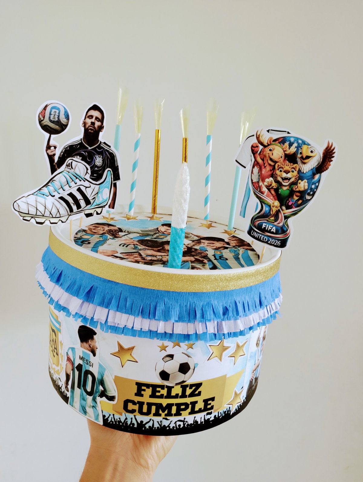 Algunos mini toppers de la temática para decorar, brillos y velas ficticias o banderines + una vela real para que sople o una bengala (de acuerdo al motivo del festejo)